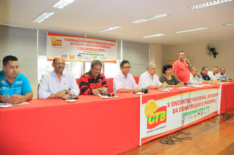 Compuseram a mesa de abertura, Onofre Gonçalves, presidente da CTB-SP; Antônio Lopes, presidente do Sindicato dos Marceneiros de SP e da União Internacional de Sindicatos da Construção e Madeira – UITBB; Lucia Maia, presidente da Federação Latino-Americana de Trabalhadores da Construção e Madeira – Flemacon; e Miraldo Vieira, secretário-geral da Confederação Nacional dos Trabalhadores na Indústria da Construção e do Mobiliário – Contricom, além de diversos representantes de sindicatos estratégicos do setor.