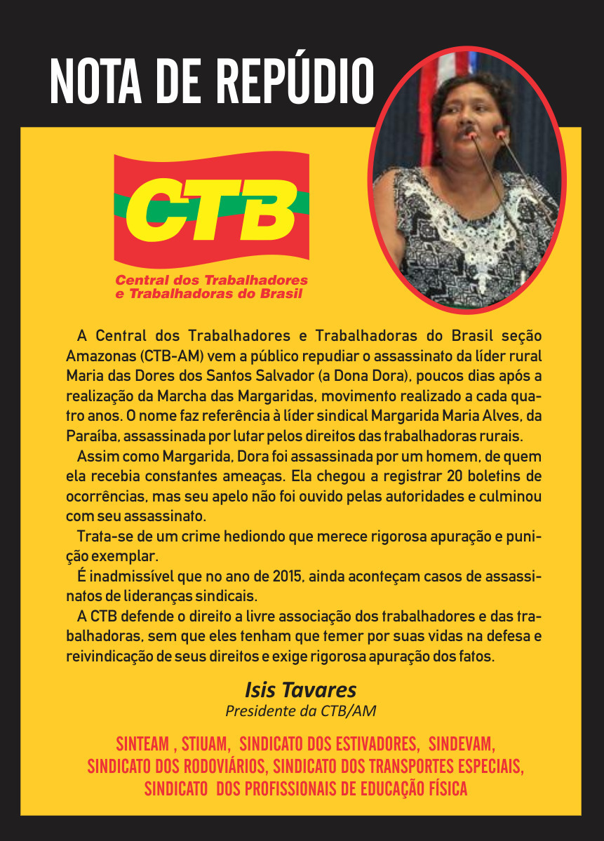 A CTB-AM divulgou nesta sexta-feira (14) uma veemente nota de repúdio ao assassinato de dona Dora, como era conhecida a líder rural. Igual a Margarida Alves, assassinada em 1983 pelo latifúndio, Dora levou cinco tiros no rosto. “Dora foi assassinada por um homem, de quem ela recebia constantes ameaças. Ela chegou a registrar 20 boletins de ocorrência, mas seu apelo não foi ouvido pelas autoridades”, reclama Isis.
