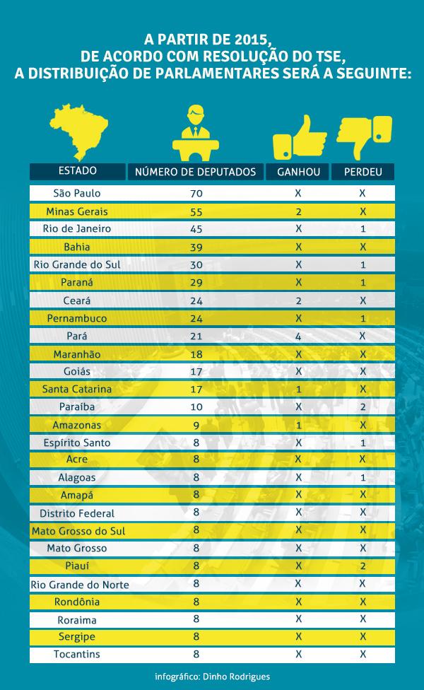 Conforme a decisão original do tribunal, perderão uma cadeira os estados de Alagoas e Pernambuco, do Espírito Santo, Paraná, Rio de Janeiro e Rio Grande do Sul. Ficarão sem duas cadeiras a Paraíba e o Piauí. Ganharão uma cadeira o Amazonas e Santa Catarina; duas cadeiras, o Ceará e Minas Gerais. O maior beneficiado é o Pará, que terá mais quatro deputados.