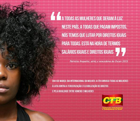 O ato das mulheres neste domingo (8) – Dia Internacional da Mulher – promete levar milhares de pessoa, comprometidas com a causa da igualdade de direitos, para as ruas da metrópole. A concentração acontece no Vão do Masp, na Avenida Paulista, a partir das 10h. “Estaremos nesse ato defendendo mais respeito às mulheres em todos os seus direitos como o de poder decidir sobre suas vidas, sem serem molestadas”, realça Ivânia Pereira, secretária da Mulher Trabalhadora da CTB.