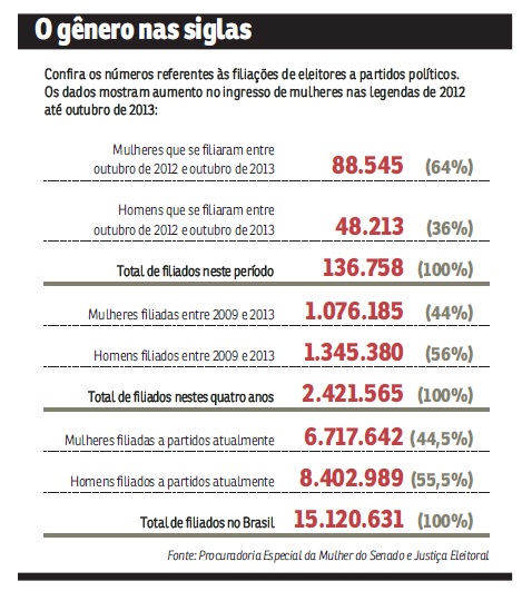A quantidade de mulheres filiadas a partidos políticos cresceu de forma significativa desde as últimas eleições municipais, embora elas continuem sendo a minoria na política brasileira. Entre as 136 mil pessoas que ingressaram em alguma das mais de 30 legendas, no período de outubro de 2012 ao mesmo mês de 2013, 64% são mulheres. Os números, no entanto, estão longe de significar que o público feminino esteja disposto a se candidatar neste ano e que os partidos lançarão para valer o mínimo de 30% de mulheres no rol de seus candidatos. É comum as siglas recorrerem a manobras, como a cooptação de laranjas, para cumprir a cota.