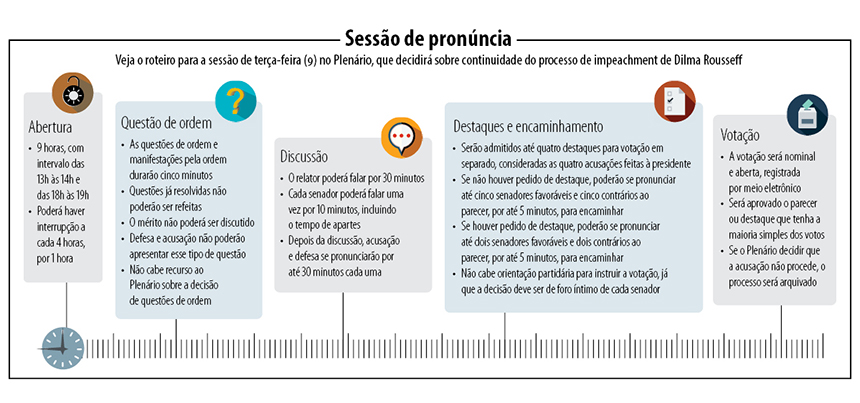 O Plenário decide na terça-feira (9), a partir das 9h, se a presidente afastada Dilma Rousseff vai a julgamento por crimes de responsabilidade. A votação encerra a fase de pronúncia, segunda etapa do processo de impeachment. Caso a maioria simples dos senadores aceite o parecer da Comissão Especial do Impeachment, Dilma será julgada e pode perder definitivamente o mandato.