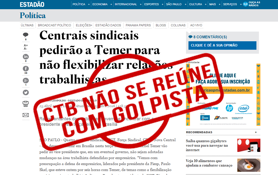 Ao contrário do que foi noticiado, nesta segunda-feira (25), em matéria do jornal Estado de São Paulo, o Estadão, intitulada “Centrais sindicais pedirão a Temer para não flexibilizar relações trabalhistas”, a Central dos Trabalhadores e Trabalhadoras do Brasil (CTB) informa que não participará de reunião, nesta terça-feira (26), em Brasília, com o vice-presidente Michel Temer. O encontro foi convocado pelos dirigentes sindicais da Força Sindical, UGT, CSB e NCST.