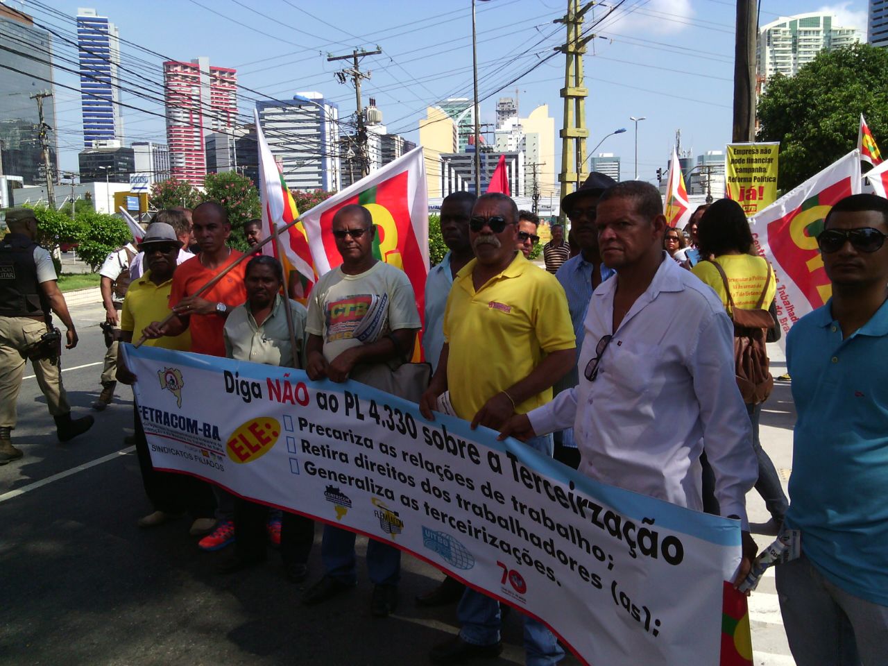Em seu discurso, o presidente da CTB, Adilson Araújo, falou sobre o agravamento da luta social depois das eleições: “Não foi à toa que, enquanto a gente levava porrada na frente do Congresso na última quarta-feira (8), enquanto éramos postos para fora da nossa Casa, dentro da Câmara estavam o Skaf e toda a direção da Fenaban, fazendo lobby para que fosse aprovado o PL 4.330. Esse Congresso que está aí foi todo financiado pelo dinheiro das grandes empresas, e agora elas estão indo cobrar a conta na forma da retirada de direitos! A gente não pode ter medo de fazer esse debate, de defender o pouco de dignidade que a gente conquistou e que agora eles querem tirar”. Aproveitou também para congratular o sindicato dos professores públicos de São Paulo, a APEOESP, pela mobilização que realizavam naquele momento na Assembleia Legislativa do Estado de São Paulo, onde entraram em audiência com os parlamentares para negociar o fim da greve da categoria. Esses professores mais tarde se juntaram à concentração na FIESP.